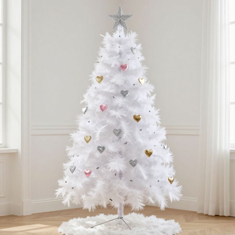 I set up a small white feather tree adorned with silver pink and gold hearts - Year Round Christmas Tree
