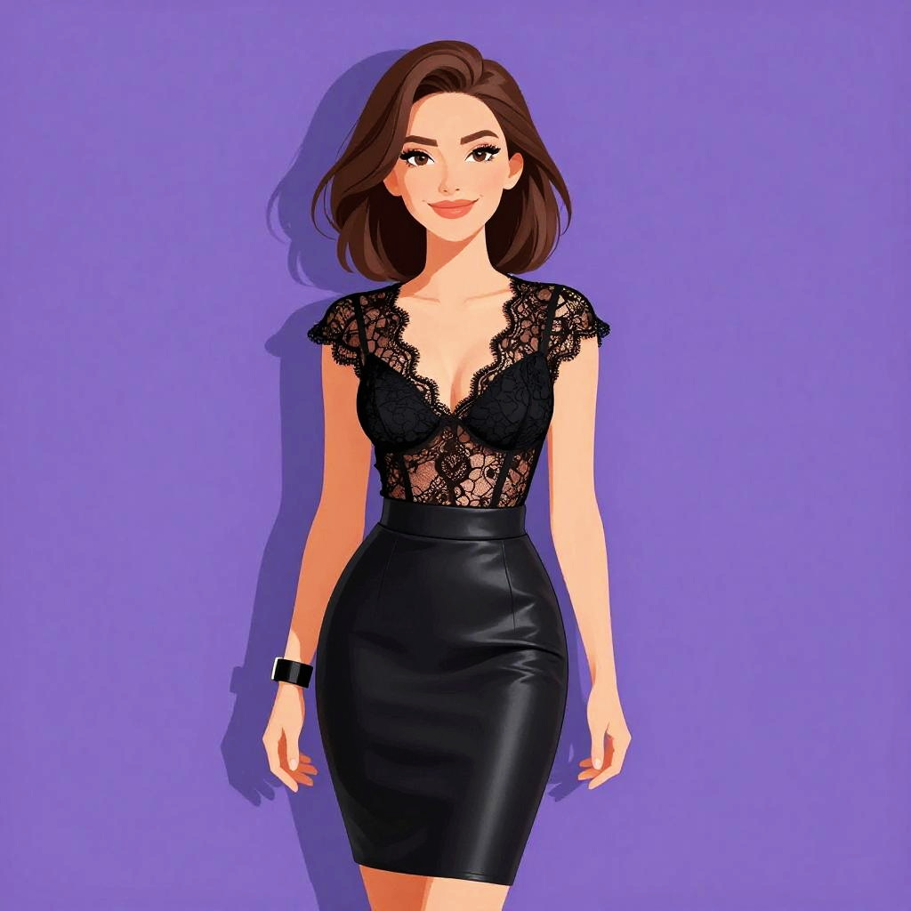 Illustration of a woman with long brown hair and a pretty face, wearing a sexy black lace bodysuit with a plunging V neckline, sheer panels, opaque fabric, high-cut leg, and spaghetti straps. The sleeveless bodysuit features intricate lace detailing and fits closely to the body, set against a solid purple background.