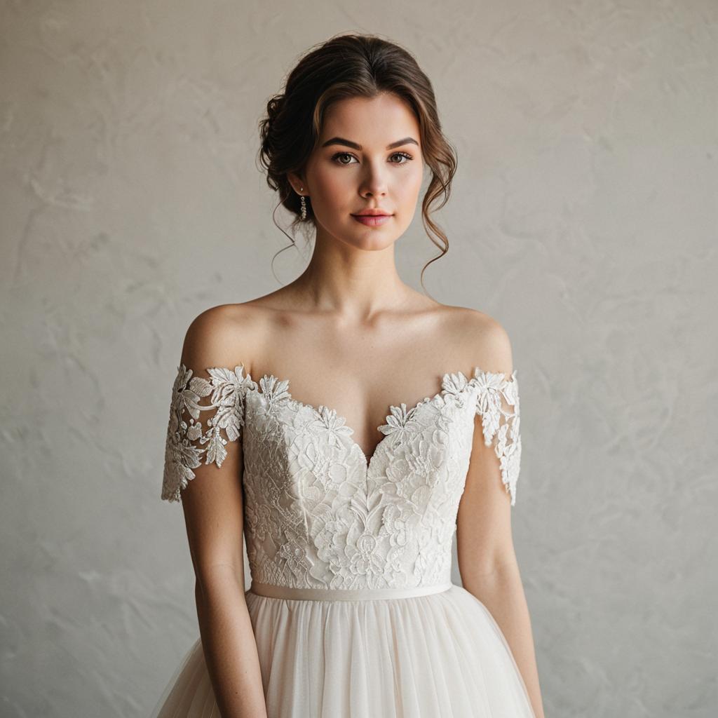 Designer dress woman wedding, photorealistic, beautiful young woman, wearing elegant off-shoulder white wedding dress, intricate lace detailing, slight v-neck, A-line skirt, brown wavy hair in updo, soft makeup, subtle blush, neutral background with gray and beige hues, standing, looking directly at camera, soft lighting, realistic ures, bridal fashion, portrait style, neutral expression, medium shot, standing in front of a plain wall