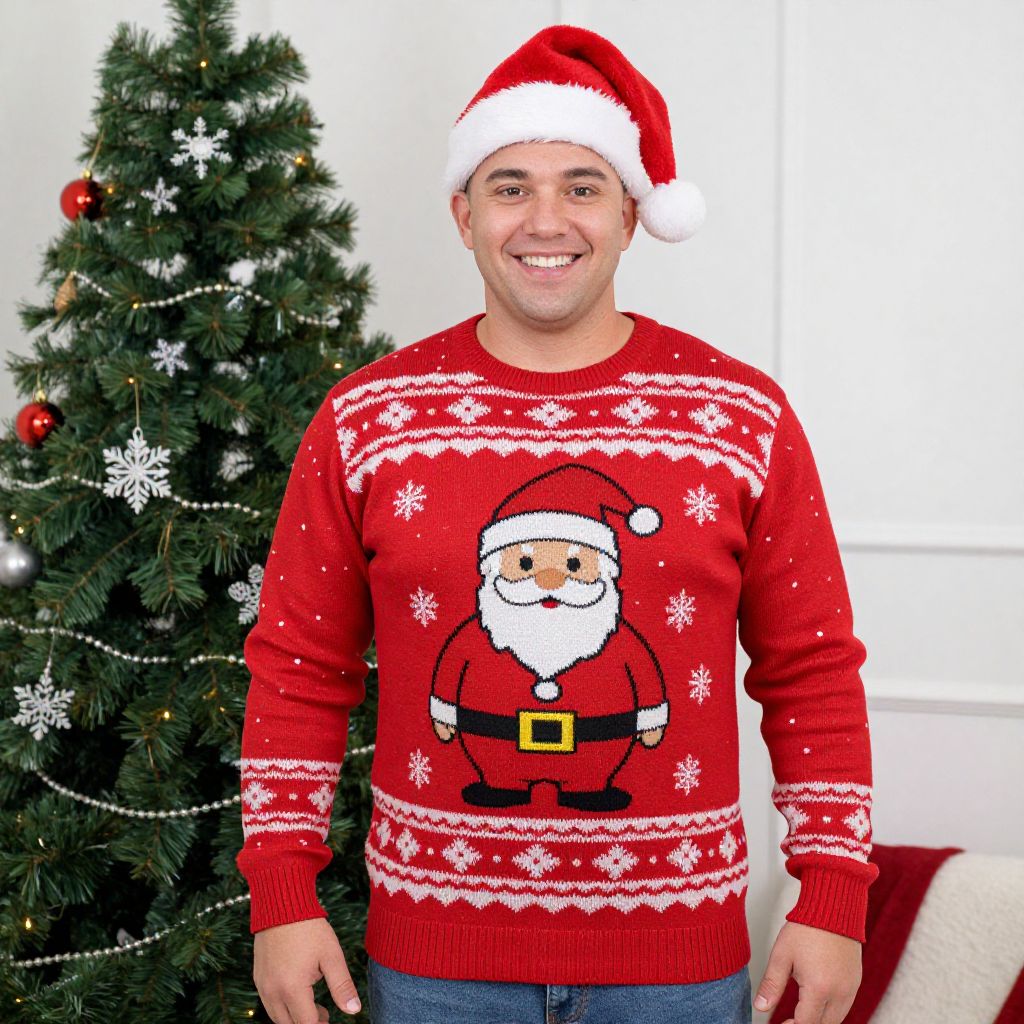 Plus Christmas Jumper Costume, dressed in a santa claus sweater standing in front of a christmas tree