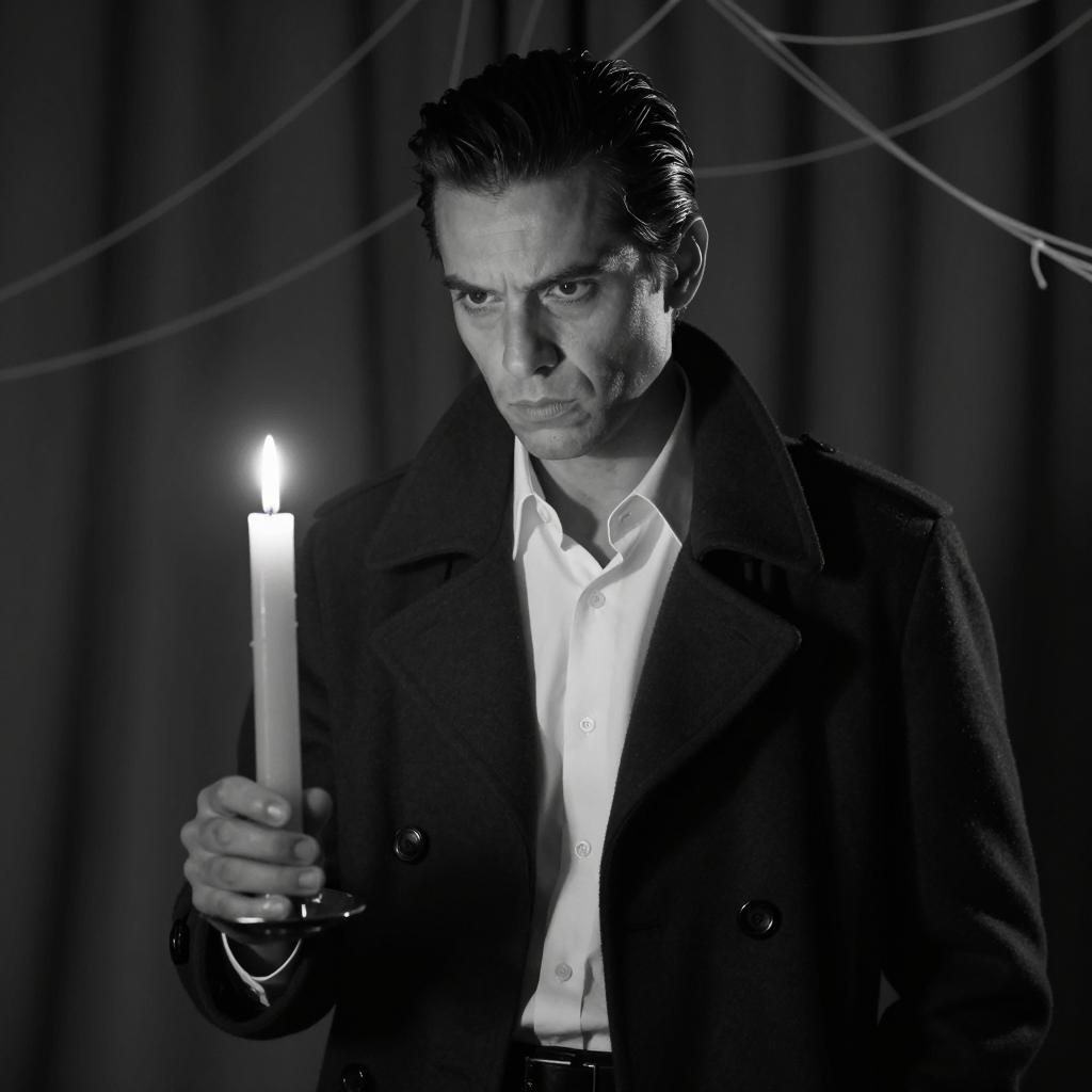 Black-and-white photograph of a man with slicked-back dark hair, intense expression, wearing a dark coat over a white shirt. He holds a tall, lit candle in his left hand. Background includes dark curtains and web-like patterns. Man stands slightly to the right, candle on the left.