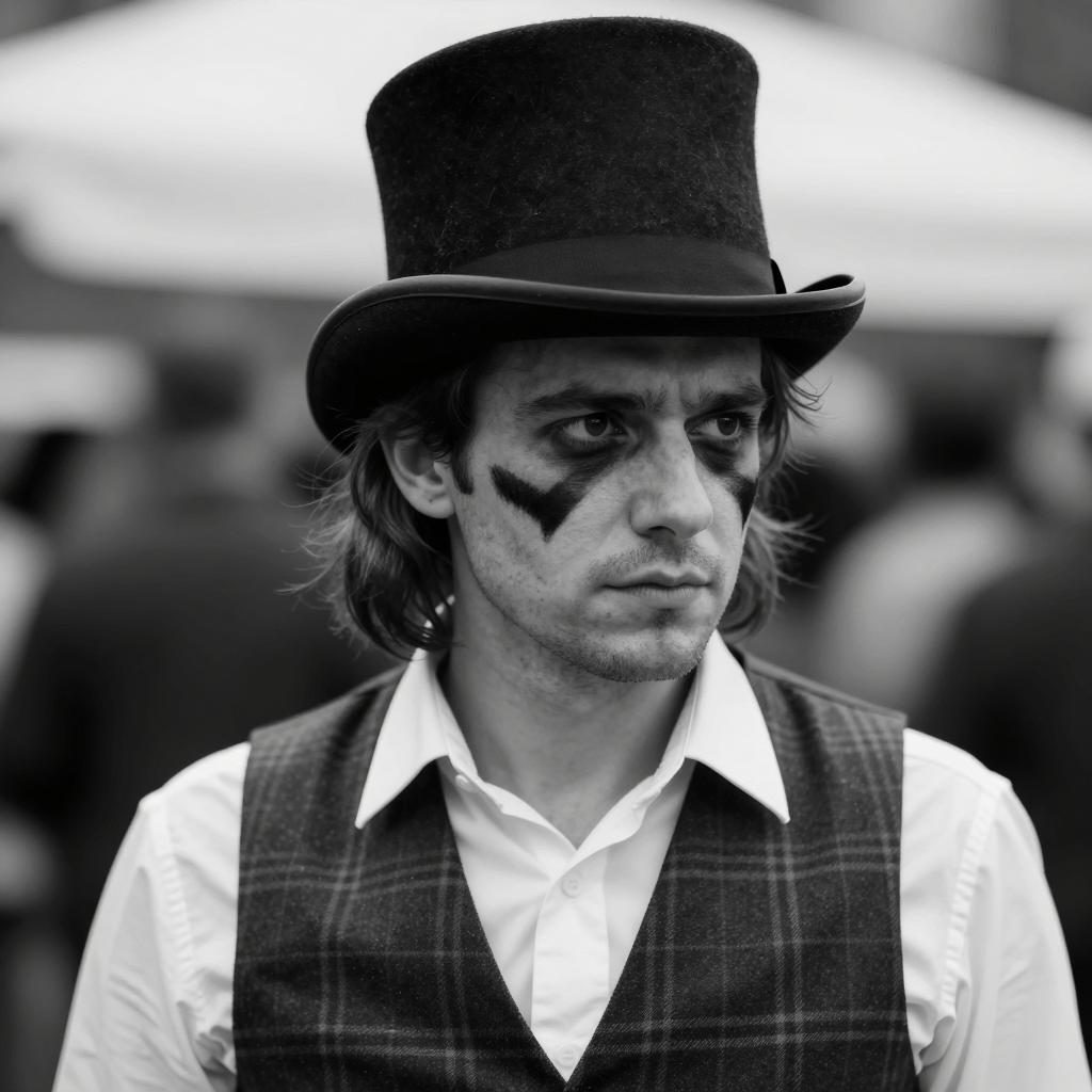 Black-and-white photograph of a man with dark, shoulder-length hair wearing a top hat and plaid vest over a white shirt. He has black face paint in the shape of a zigzag across his cheeks. Background is blurred with dark and light patches. Man's expression is intense, looking slightly to the right. Blurred dark shape in background.