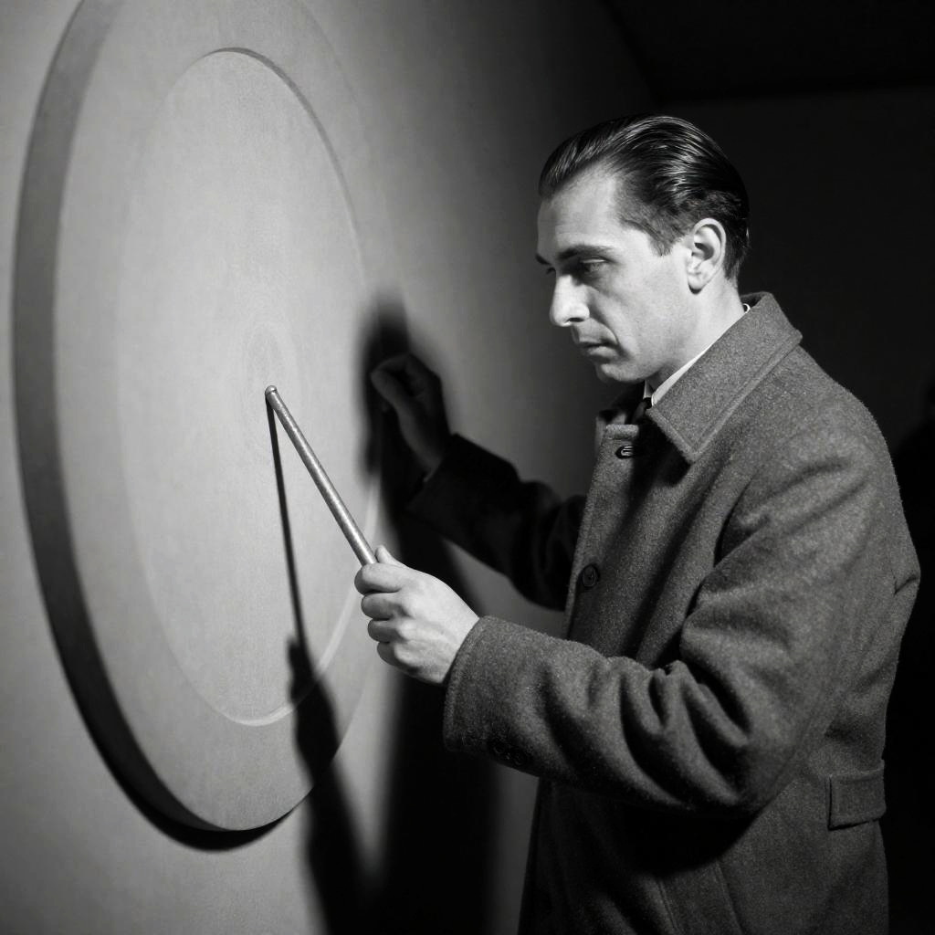 Black and white photograph of a man with short, dark hair and a serious expression, wearing a dark suit, drawing a large, abstract, curving line on a ured, patterned wall. His right hand holds a pen, tracing the line. The background is the ured wall, which has a grid-like pattern. The man is positioned slightly to the left, facing right.