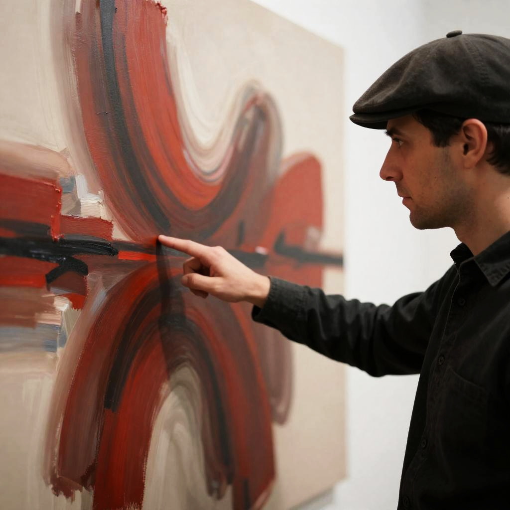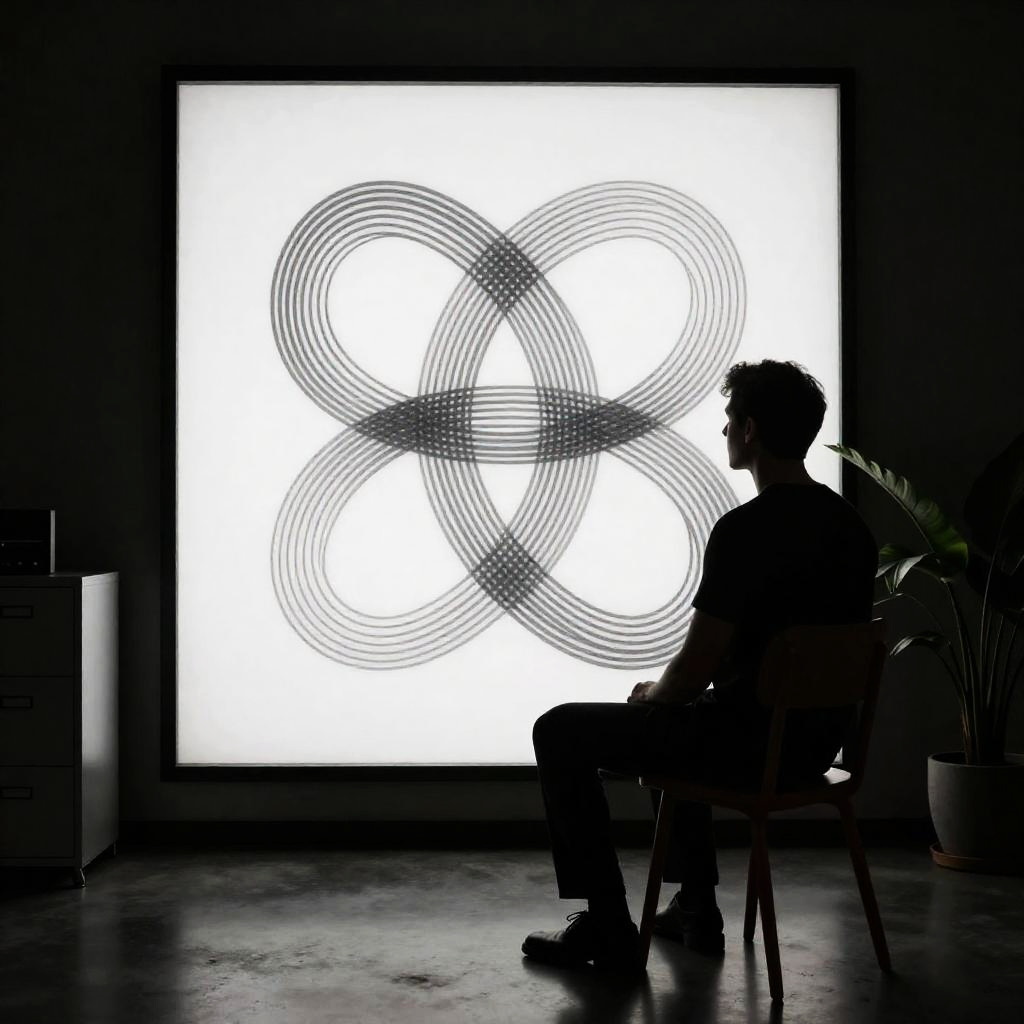 Black and white photo of a man with short dark hair and a serious expression, wearing a dark suit with a white shirt, drawing a large abstract curving line on a textured, patterned wall using a pen. The man is positioned in profile, facing right, captured indoors in a minimalist setting.