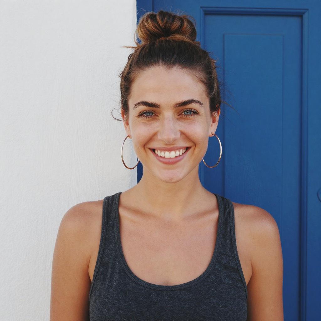 Photograph of a smiling woman with light skin and brown hair in a top knot. She's wearing large hoop earrings and a dark gray tank top, standing against a textured white wall with a blue door in the background. She has blue eyes, well-defined eyebrows, and is looking directly at the camera. The image has vibrant colors and a slightly over-saturated look.