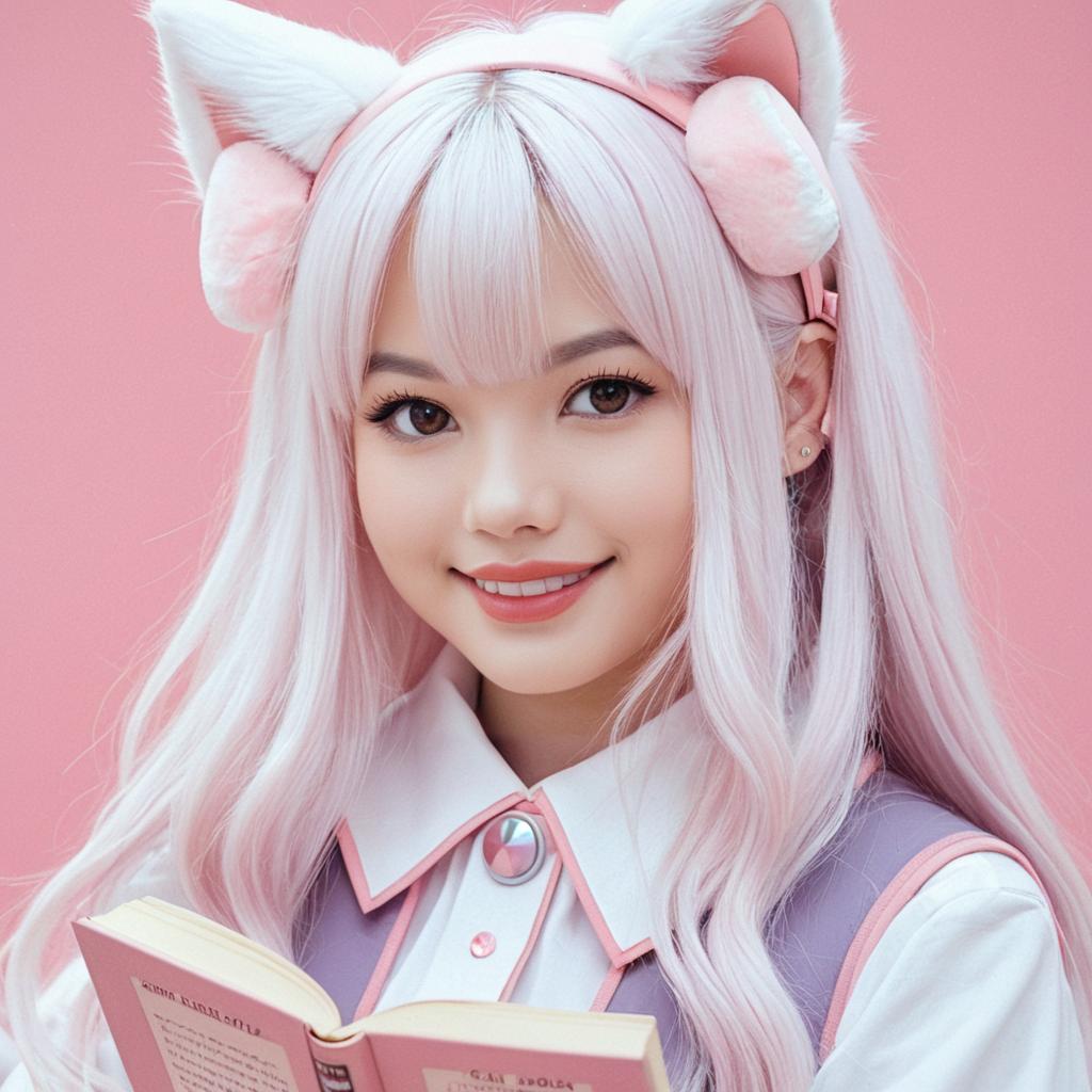 A digital photograph of an Asian woman with long, white, silky hair wearing a white and pink anime-style costume with cat ears. She has fair skin, large dark eyes, and a bright smile. She holds an open book in front of her chest. Her costume features a high-collared shirt with pink buttons and pink accents. The background is a solid, soft pink. The image has a high-contrast, slightly glossy finish, emphasizing the textures of her hair and costume. The overall style is cute and whimsical.