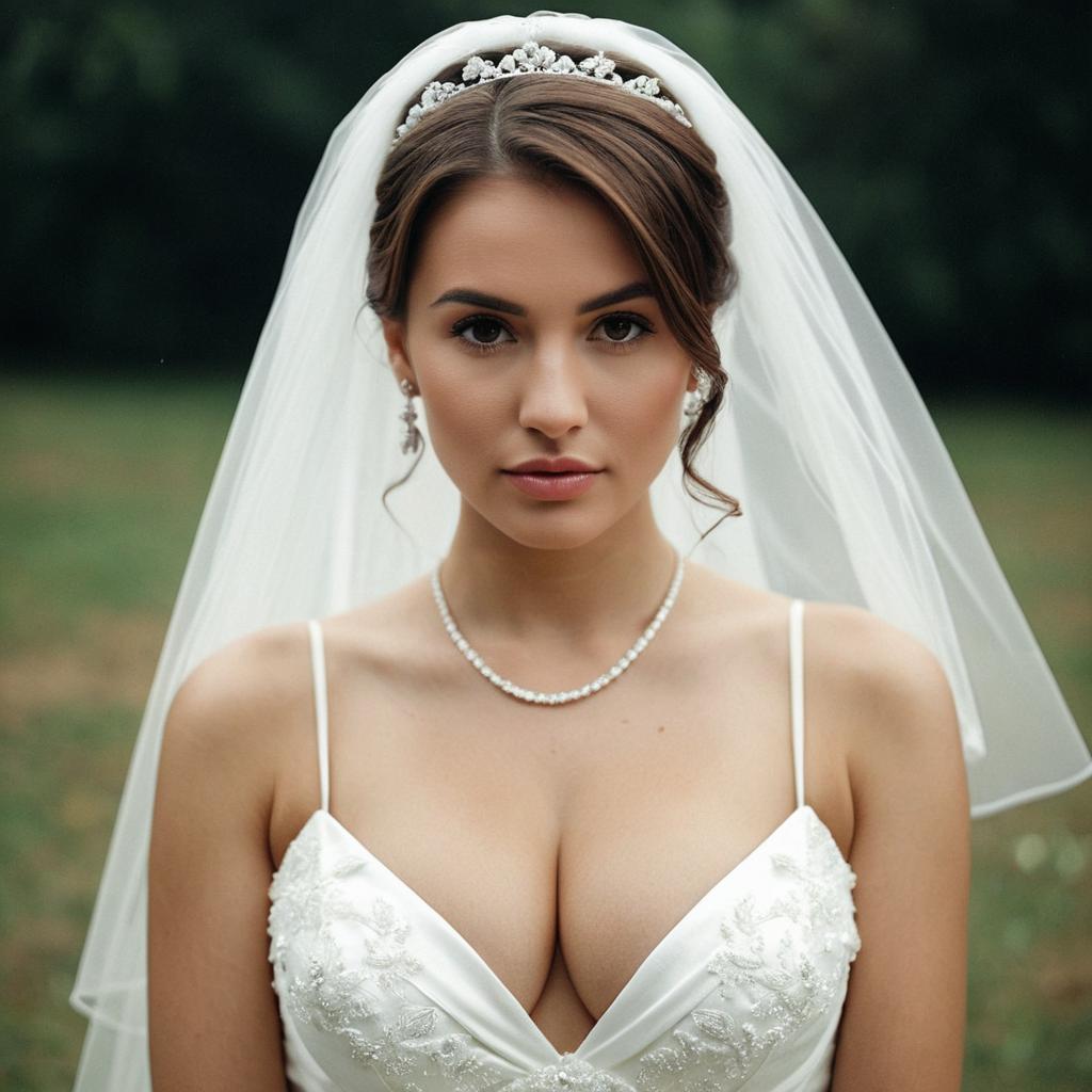 Styled wedding shoot,1girl, dress, solo, jewelry, earrings, veil, white dress, breasts, wedding dress, brown hair, realistic, looking at viewer, bridal veil, blurry background, outdoors, cleavage, blurry, brown eyes, medium breasts