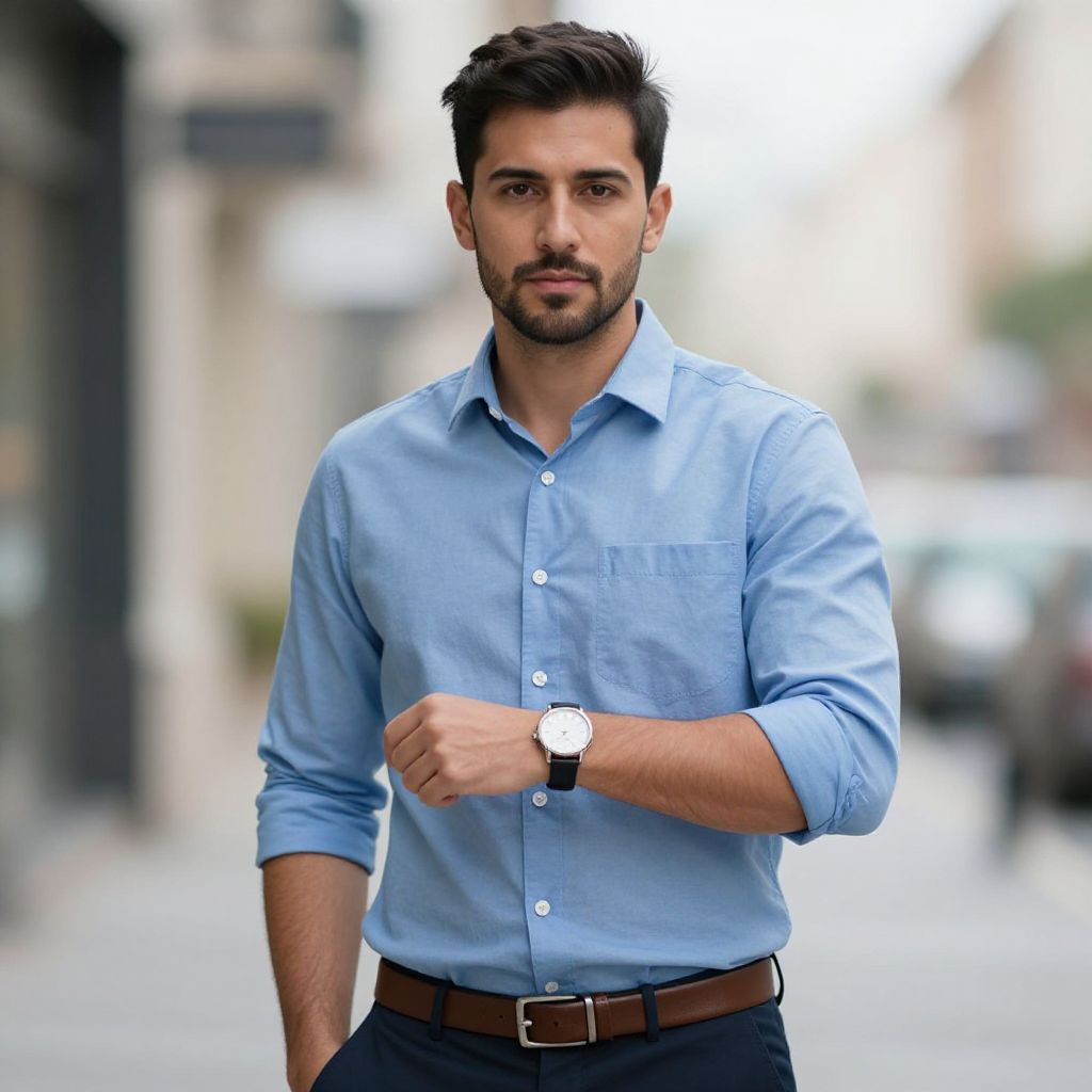 Man blue dress shirt, 1boy, male focus, watch, solo, wristwatch, shirt, blue shirt, facial hair, blurry background, blurry, belt, collared shirt, realistic, brown belt, looking at viewer, black hair, pocket, short hair, pants, sleeves rolled up