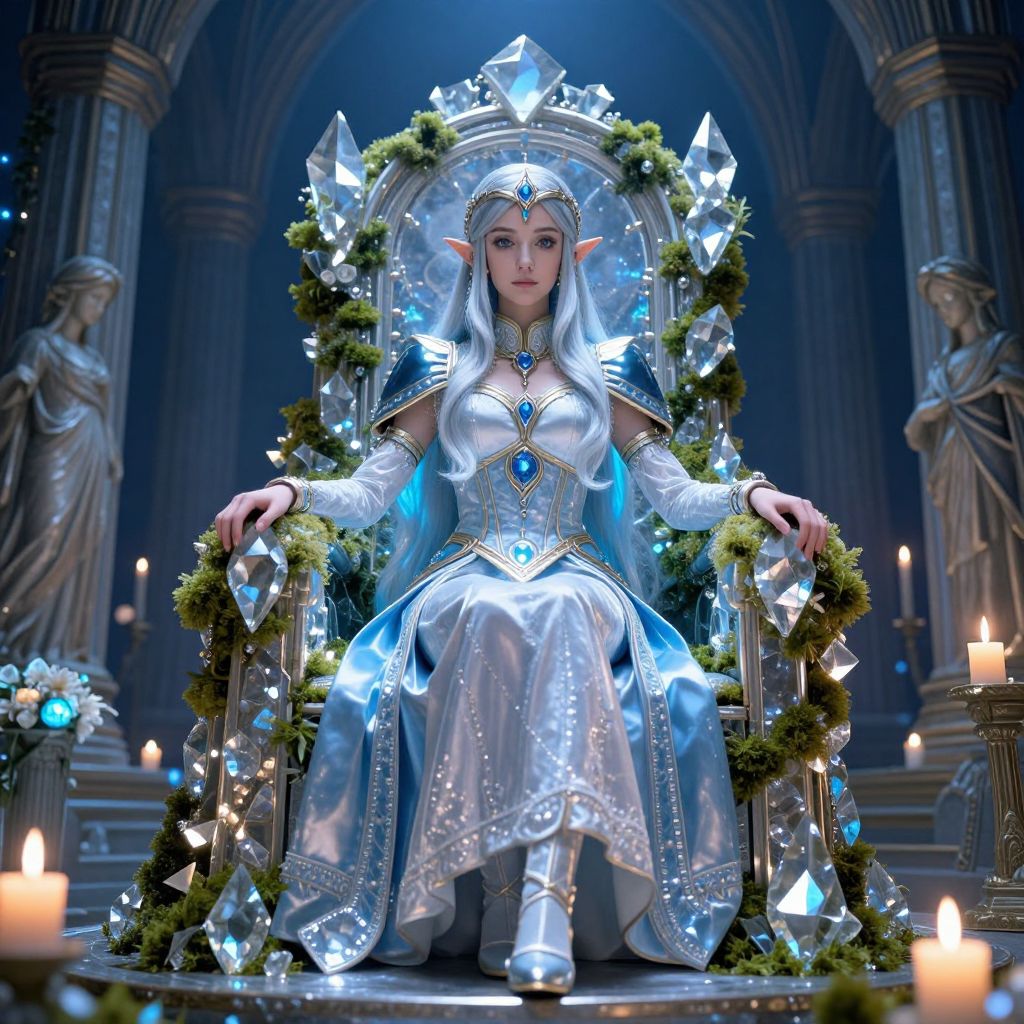 Digital artwork of an elf queen with long white hair, silver dress, and star crown, seated on a crystal throne in a candlelit, cathedral-like