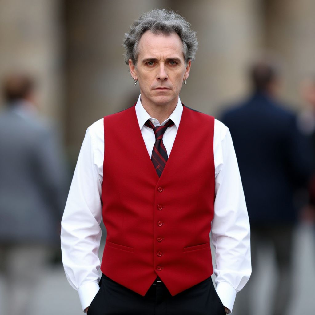 Photograph of a middle-aged man with gray, slightly wavy hair and a serious expression. He wears a white dress shirt, black tie with a small red pattern, and a bright red vest. The background is blurred, with indistinct figures of people dressed in dark clothing. The man's skin is light, and he stands with his hands in his vest pockets, facing the camera directly. The image has a shallow depth of field, focusing on the man while the background remains out of focus. The overall style is realistic with natural lighting.