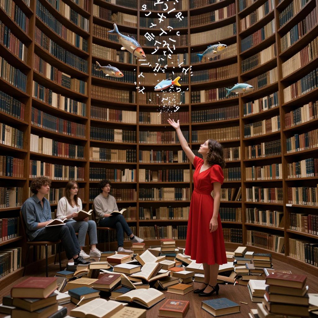 Books float like fish above a grand library, where readers sit beneath shelves brimming with knowledge, while a woman in a red dress stands amidst scattered volumes, reaching out to capture the shimmering words suspended in the air.
