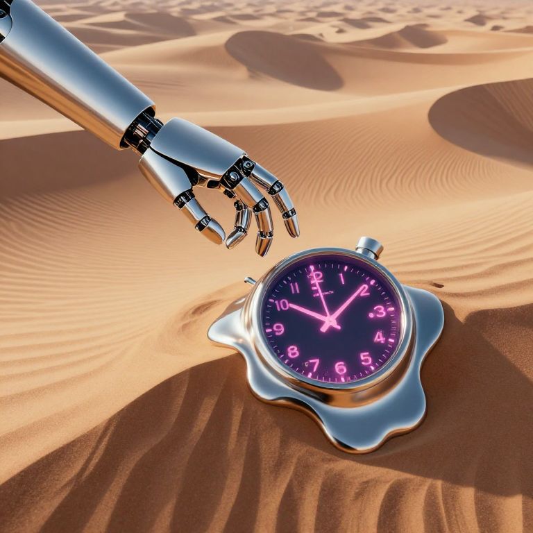 A digital illustration shows a metallic, robotic hand with articulated fingers extending from the left, touching a sleek, silver, wristwatch-style clock with a purple face and pink glowing numbers and hands. The clock rests on a sunlit, sandy desert with rippled textures and shadows, creating a contrast between the metallic and organic elements. The background features undulating sand dunes under bright sunlight, enhancing the clock's futuristic and surreal appearance.