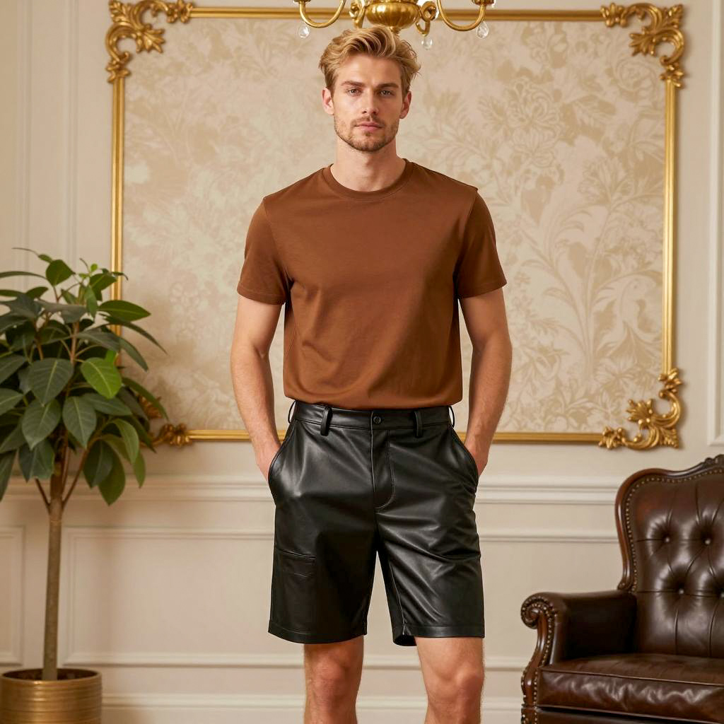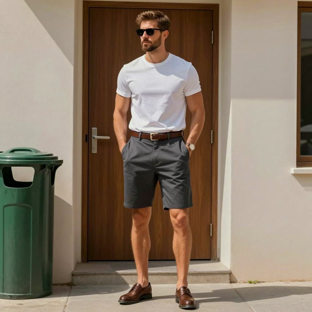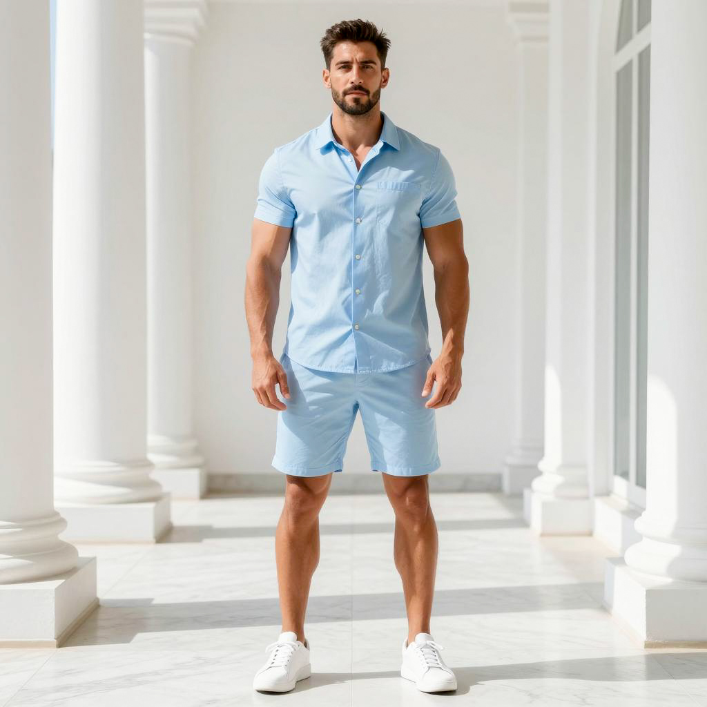 White dress sneakers man, photorealistic portrait of a muscular man, standing, wearing light blue short-sleeve button-up shirt and matching light blue shorts, white sneakers, short dark brown hair, trimmed beard, neutral expression, background with white columns and bright sunlight, daytime, white marble floor, model facing camera, symmetrical composition, natural light, clean and modern aesthetic