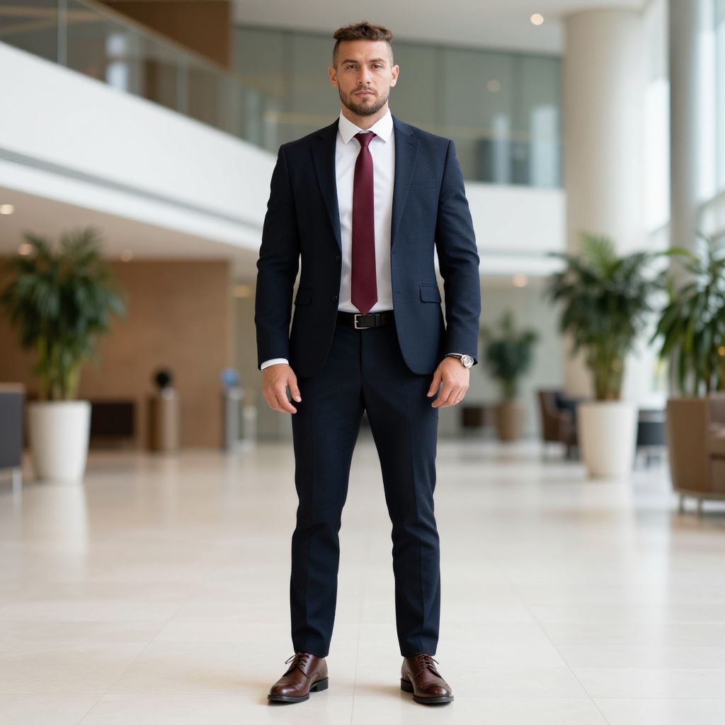 A fit European man with a flat top hairstyle, dressed in a business casual look with a burgundy tie and brown shoes, standing in a well-lit lobby of a high-rise building.