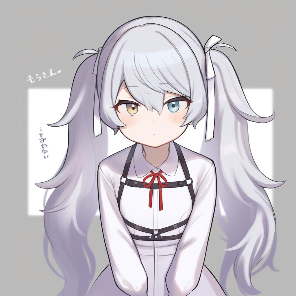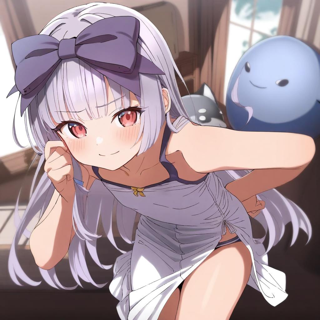 3.1-tan, os-tan, 1girl, loli, red eyes, long hair, purple hair, grey hair, blunt bangs, hair bow, flat chest, by artist redcomet, leet