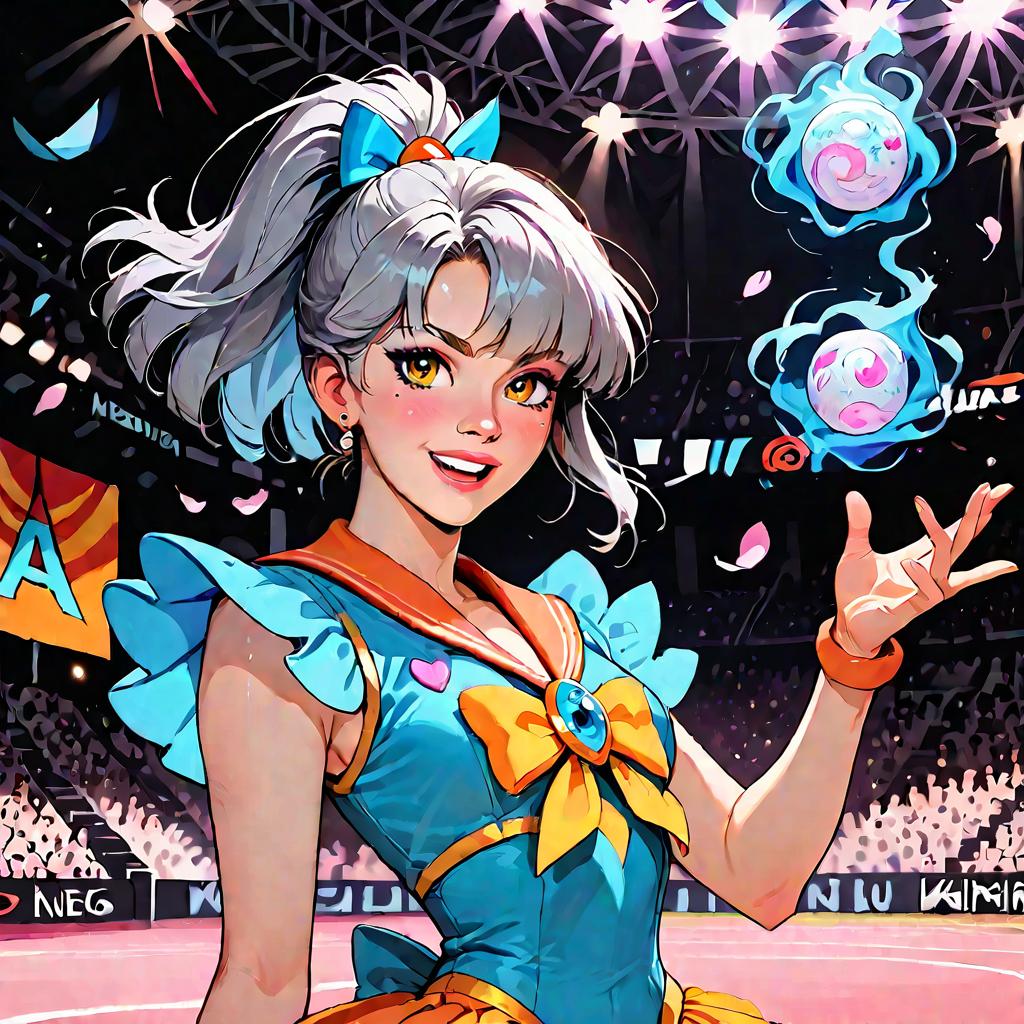 Score_9, score_8_up, score_7_up, source_anime, 1girl, red┬аeyes, happy, grin, stadium, concert, magic girl, magical girl outfit, ponytail, grey hair, magic energy, floating cherry petals
