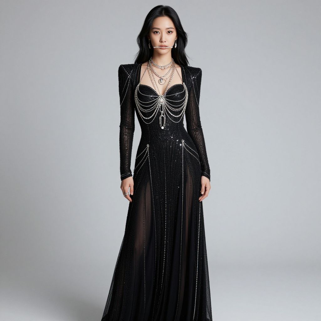 Photograph of an East Asian woman with long, wavy black hair and fair skin, standing against a plain, light gray background. She wears a black, long-sleeved, floor-length gown with a deep V-neck adorned with intricate silver chain details that drapes over her chest and shoulders. The gown has a sheer, beaded texture, adding a sparkling effect. She accessorizes with multiple layered silver necklaces. Her expression is neutral, and she stands confidently with her arms relaxed by her sides. The lighting is even, highlighting the gown's details and her elegant presence.