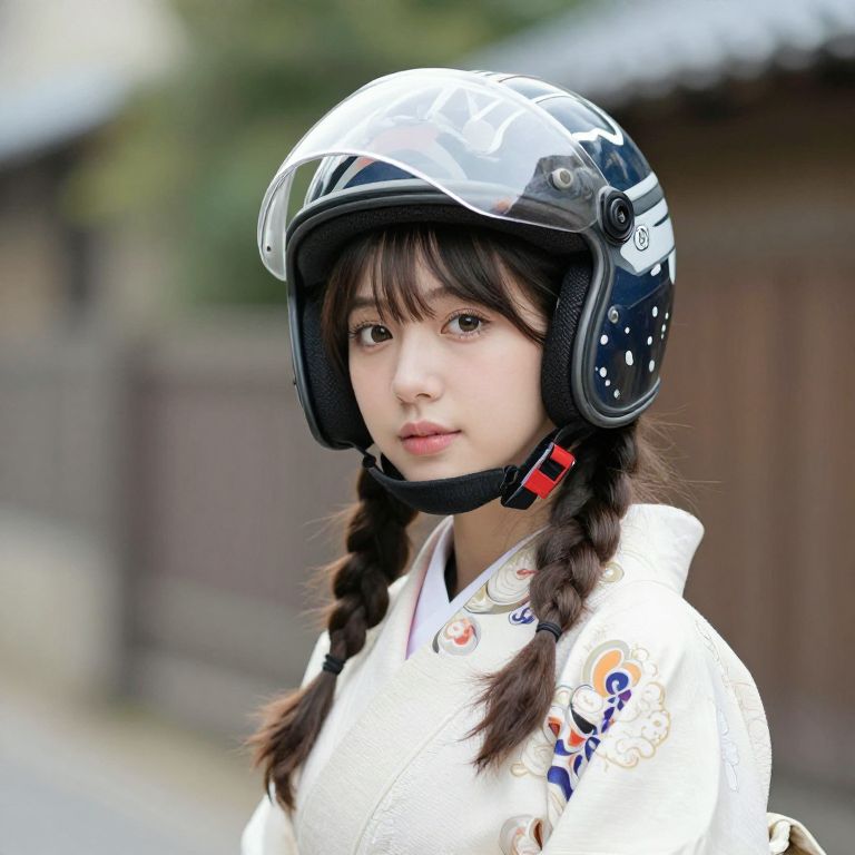 Female wearing a kimono with a helmet on her head and braids in her hair.