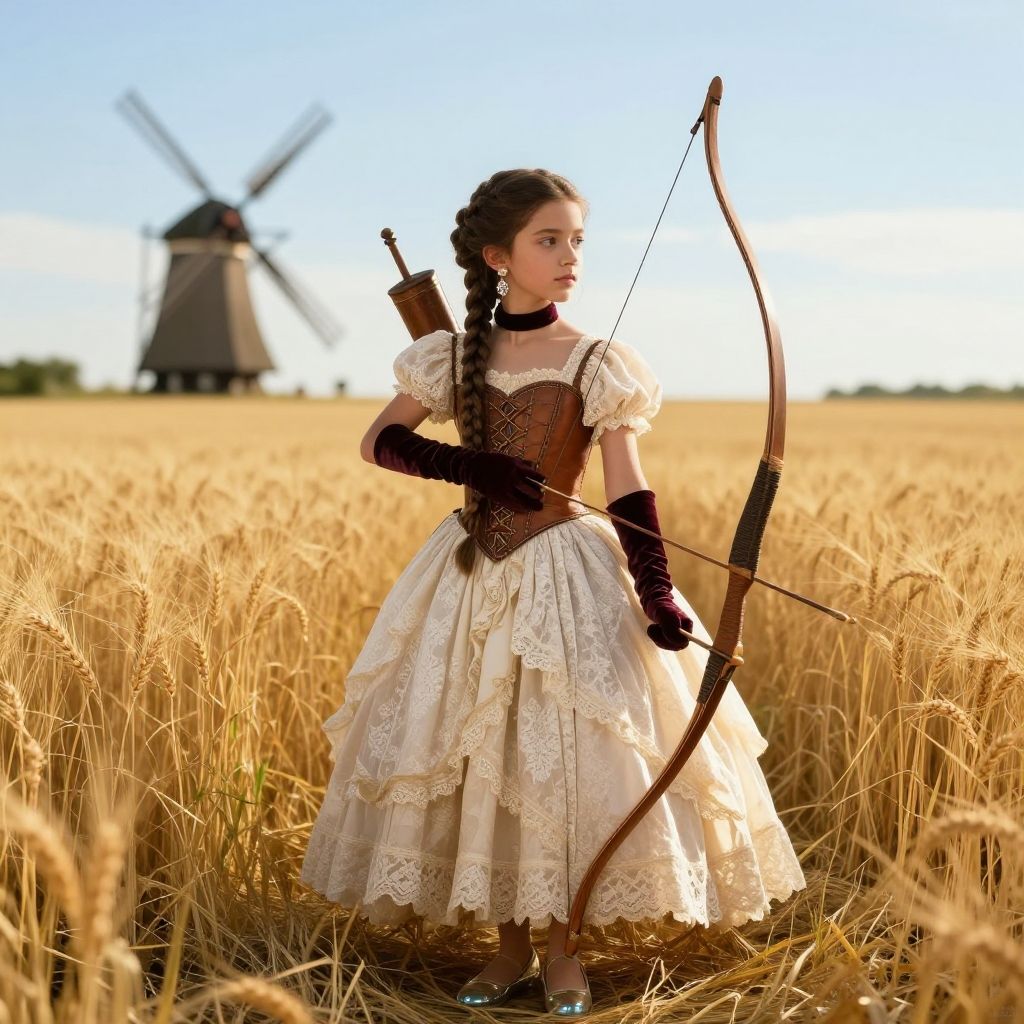Photograph of a young Caucasian girl with fair skin and dark brown hair in two braids, standing in a golden wheat field. She wears an elaborate, Victorian-style white lace dress with puffed sleeves, a brown corset, and black gloves. She holds a wooden recurve bow with a quiver of arrows on her back. The background features a clear blue sky and a blurred black windmill. The sunlight casts a warm glow on the scene, highlighting the golden wheat and the girl's detailed attire.