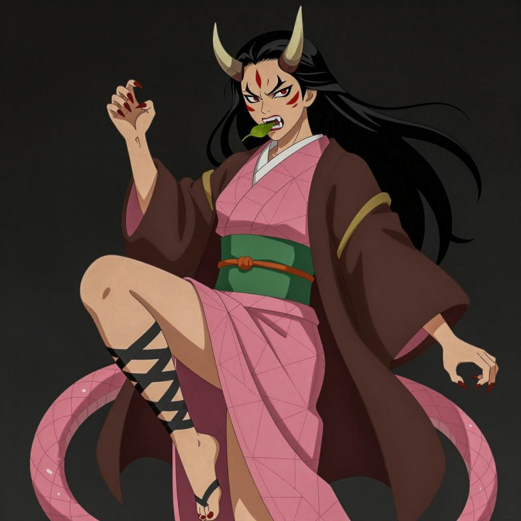 Digital illustration of a pink-skinned female warrior with long black hair, red eyes, and small white horns. She wears a pink and white kimono with deep cleavage, a black mask with red and blue circular decorations, and has a sword with a pink patterned handle on her back. Her right hand touches her hair. Bright blue background.
