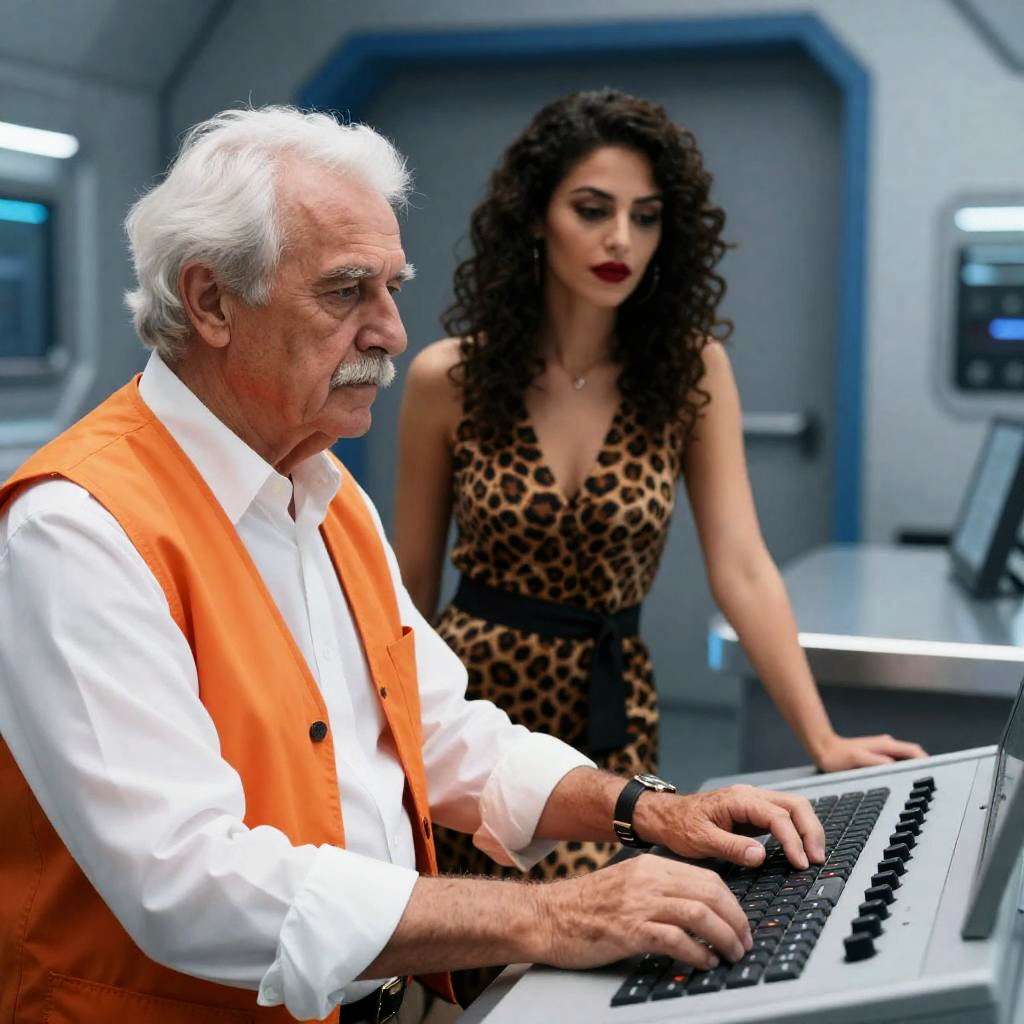 Photograph of an older man with white hair and a mustache, wearing a white shirt and orange vest, operating a control panel. A woman with dark curly hair and red lipstick stands behind him, wearing a leopard print dress. The background includes a metallic table and blue-framed doorway. The man's expression is neutral, while the woman's expression is focused. Both hands rest on the control panel. The setting appears futuristic.