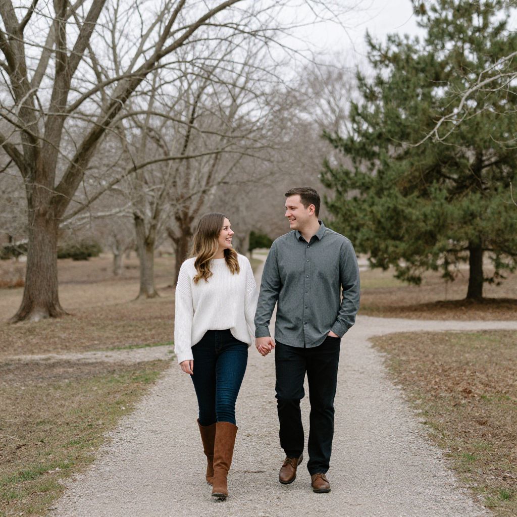 Photograph of a couple walking hand-in-hand on a gravel path in a park. The woman, with long brown hair, wears a white blouse, dark blue jeans, and brown knee-high boots. The man, with short dark hair, wears a gray button-up shirt and black pants. Both are smiling and looking at each other. The background features leafless trees and a green pine tree to the right. The sky is overcast, and the ground is covered in brown grass and dirt. The image has a soft, natural light with a slightly muted color palette.