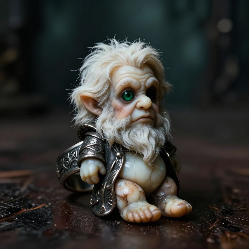 Linquivera Picture of old Howlite Toe ring in form of a A dwarf, with stubby legs, a jutting forehead, mismatched eyes├в┬А┬Фone green, one black├в┬А┬Фand a shock of hair so blond it seemed white., intricate, high quality, exclusive, strange, creepy, horror, bosstylediversified background((Fantasy-themed, fantasy art, swift brush strokes)), (Pulp:0.9), ((Dark and grim colors and mood)), embossed in metal (Victorian Gothic Art:1.3), (Dark hue:1.3), medievalcinematic photo . 35mm photograph, film, bokeh, professional, 4k