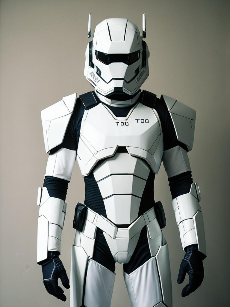 Portrait of a man wearing a detailed, realistic T-00 armor costume with white and black futuristic design elements. The costume includes a fully enclosed helmet, angular chest plate, arm and leg guards, and black underlayer gloves and suit. The background is plain and neutral, emphasizing the costume.