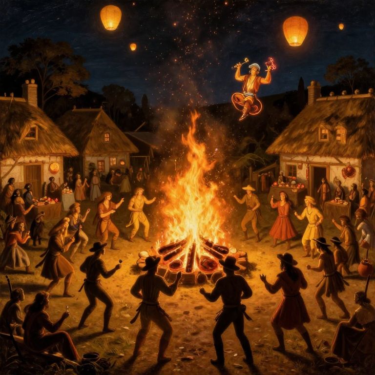 Vibrant photograph of a night-time village dance around a roaring fire, with silhouetted dancers, floating lanterns, and thatched h