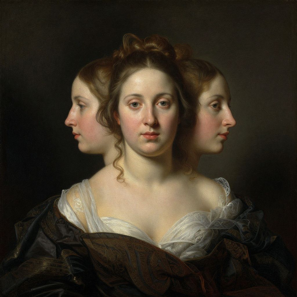 A classic oil painting of a woman with two heads, posing, by Rembrandt, featuring high contrast and double exposure, showcasing the enigmatic and classic nature of baroque art.