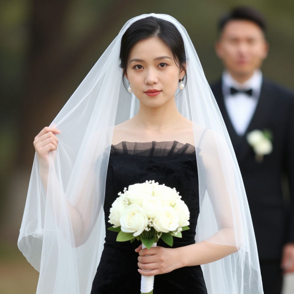 Adult bride costume, dress, solo, veil, flower, bouquet, outdoors, black dress, black hair, holding, bridal veil, looking at viewer, 1girl, holding bouquet, crossdressing, day, earrings, male focus, blurry, jewelry, blurry background, wedding dress