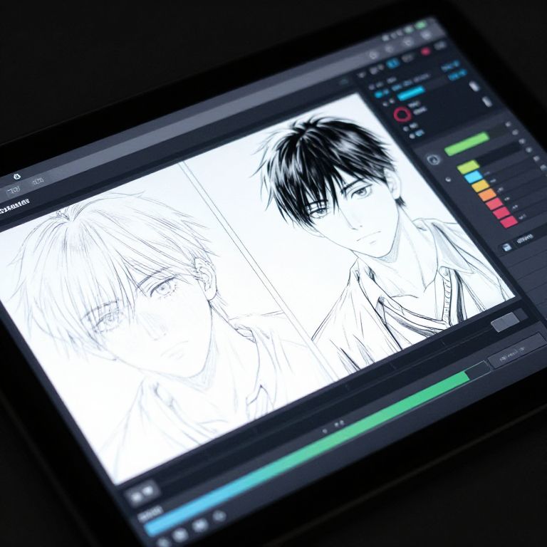Close-up of manga upscaler software interface on a futuristic digital tablet, manga sketches evolving from rough outlines to smooth, enhanced images, with colorful progress bars and data visualizations, cybernetic and minimalist design