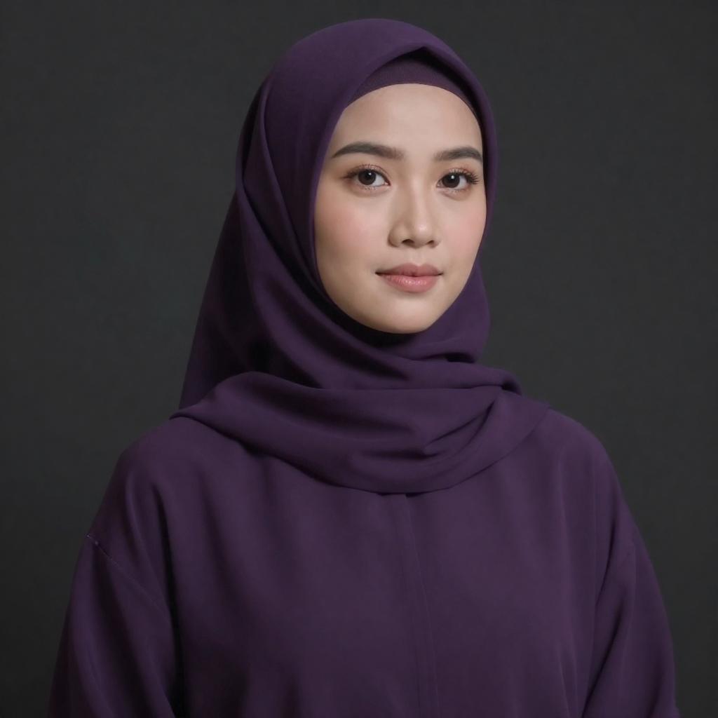 Asian woman with light skin, medium-length black hair, wearing a purple hijab and matching purple cloak, centered in the frame. Dark background with subtle green pattern on the left. She has a calm expression, looking slightly to the right.