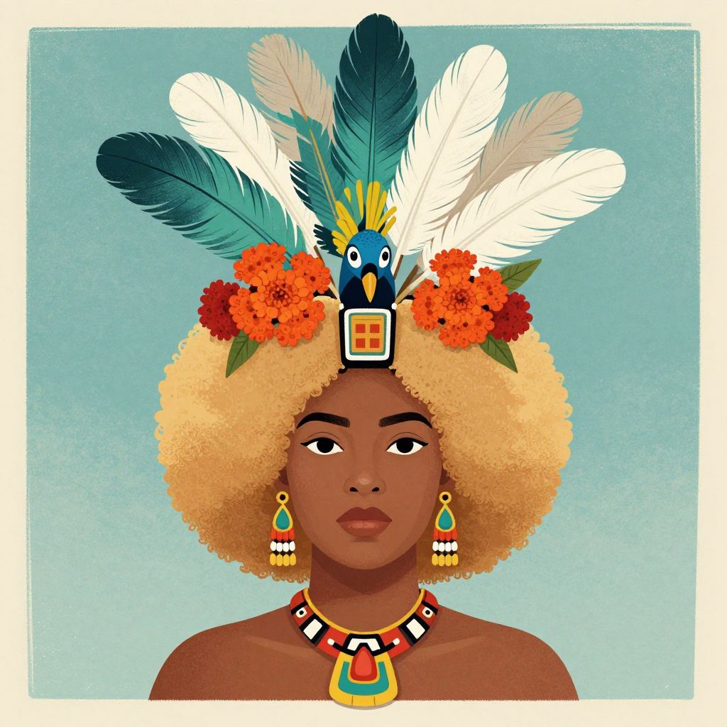 Digital illustration of a dark-skinned woman with curly blonde hair, wearing a colorful feathered headdress, orange flowers, turquoise earrings, and a geometric