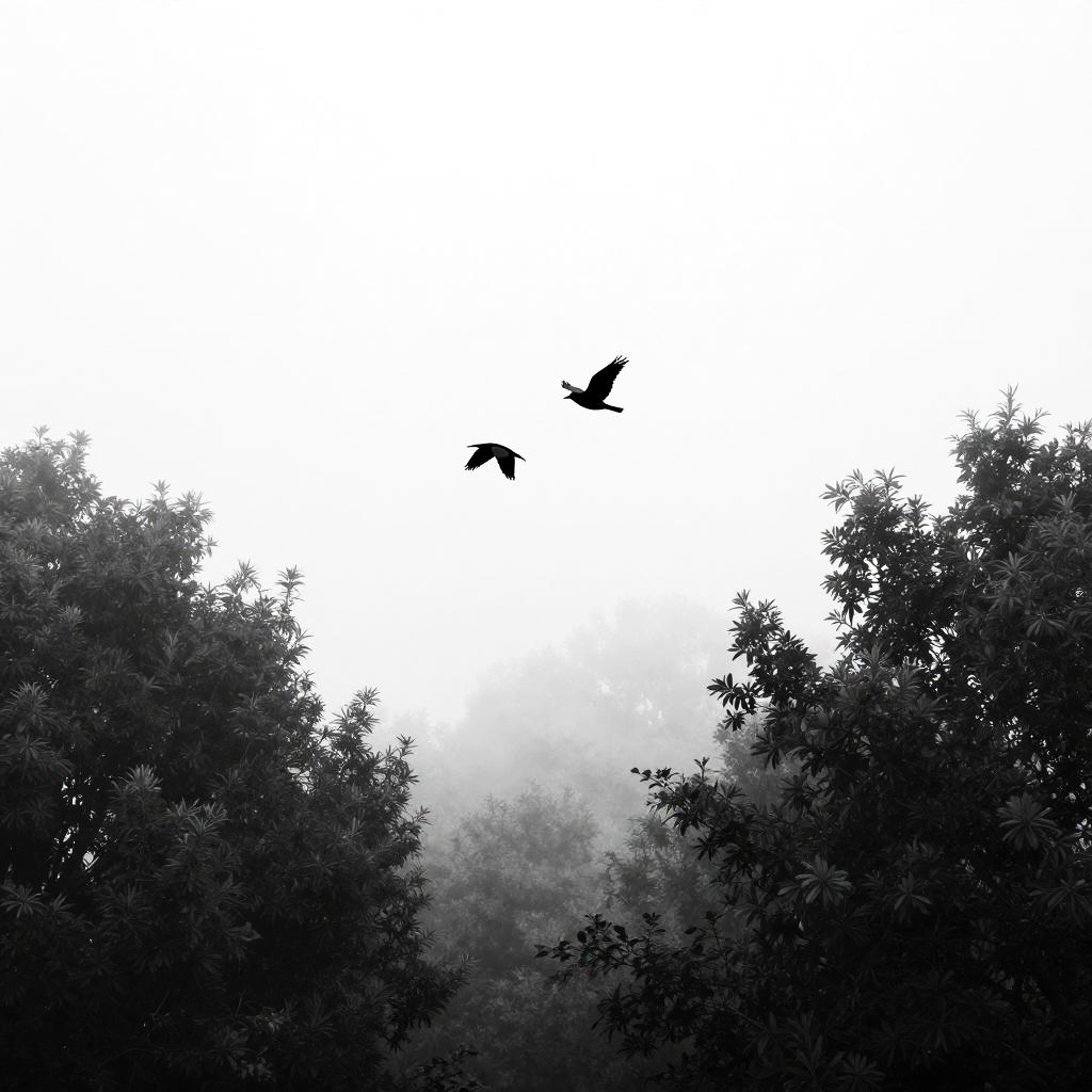 A black-and-white digital drawing shows a stark white sky with a small black silhouette of two birds in mid-flight at the center. The sky is surrounded by dense, dark trees with a foggy, misty effect at the edges. The contrast between the bright sky and dark trees creates a dramatic, almost surreal atmosphere. The image has a minimalist, high-contrast style.