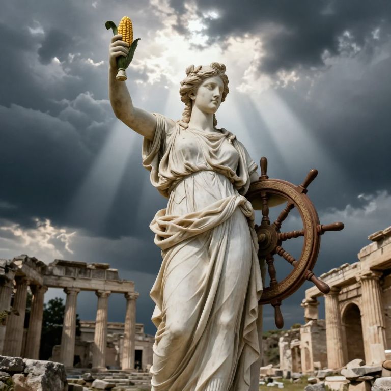 Photograph of a white marble statue of a classical goddess holding corn, standing in front of ancient ruins with a ship's wheel, under dramatic, sun
