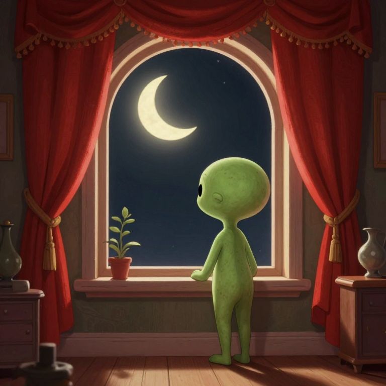 In a whimsical digital illustration, a curious alien-like character stands by an arched window, casting a gentle glow across the room, as it gazes at the crescent moon through a backdrop of richly detailed red curtains and vintage-style decor, blending retro charm with imaginative storytelling.