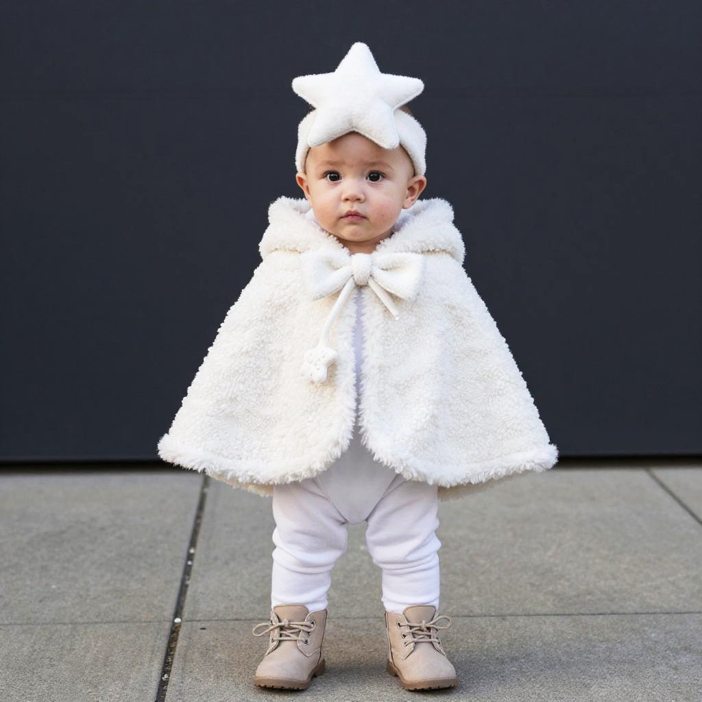 A photograph of a cute, chubby baby with light skin and dark eyes, wearing a white, star-shaped headband, a white, textured cloak with a large bow at the neck, white pants, and beige lace-up boots. The baby stands on a concrete sidewalk with a black asphalt patch in the background. The overall vibe is adorable and winter-ready.
