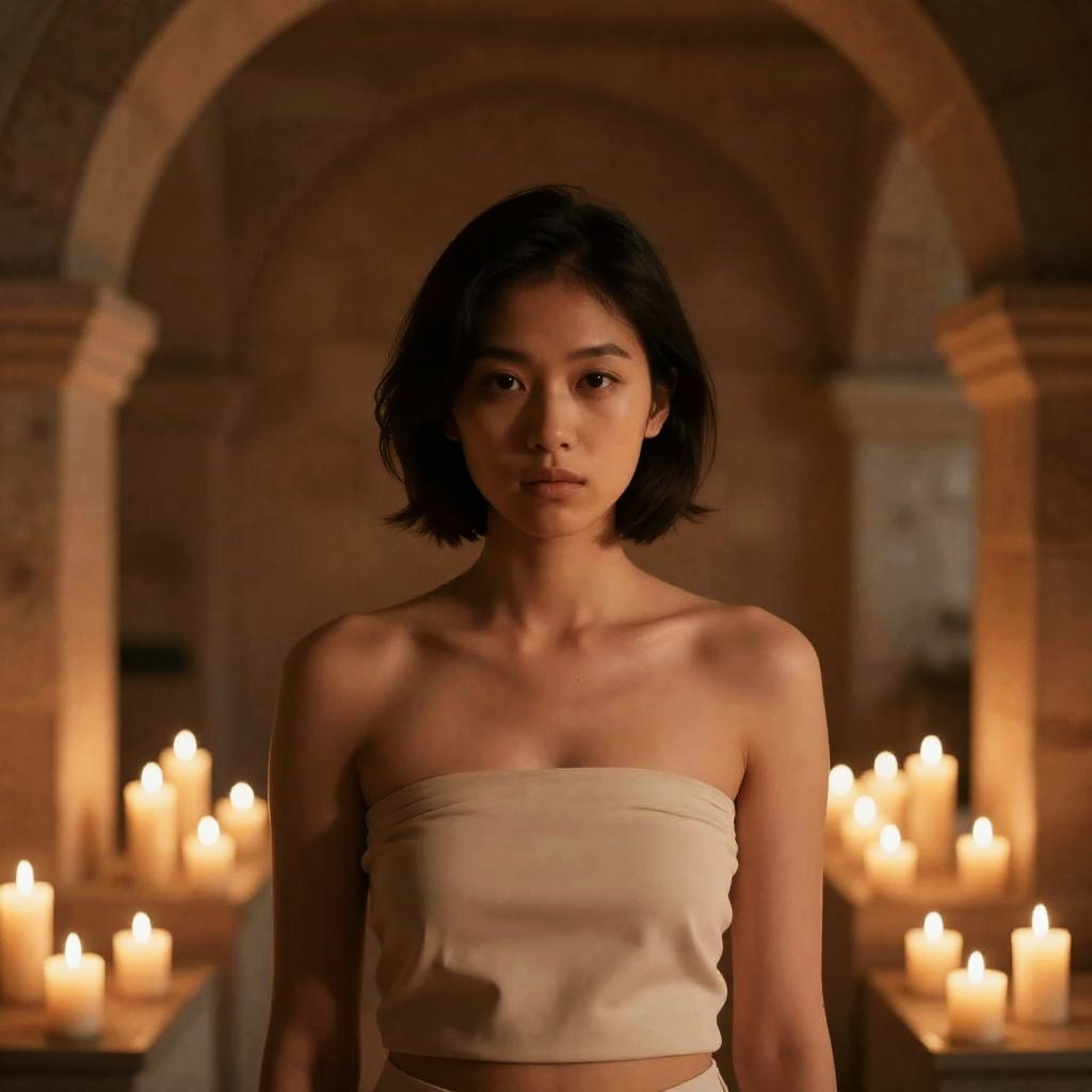Photograph of a woman with wet, slicked-back dark hair, wearing a sheer, dark brown spaghetti-strap dress. She stands in a dimly lit, industrial setting with smoke on either side. Her expression is serious and focused. Background includes control panels and metallic surfaces.