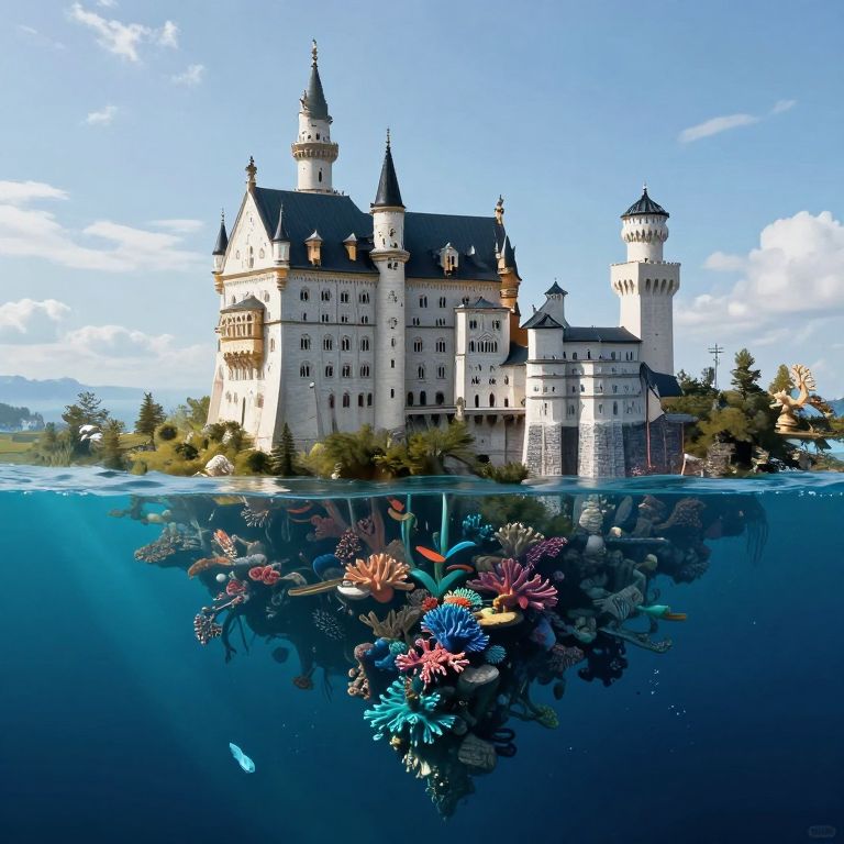 Photograph of a majestic, white castle with multiple spires and towers, partially submerged in a vibrant underwater scene with colorful coral and fish.