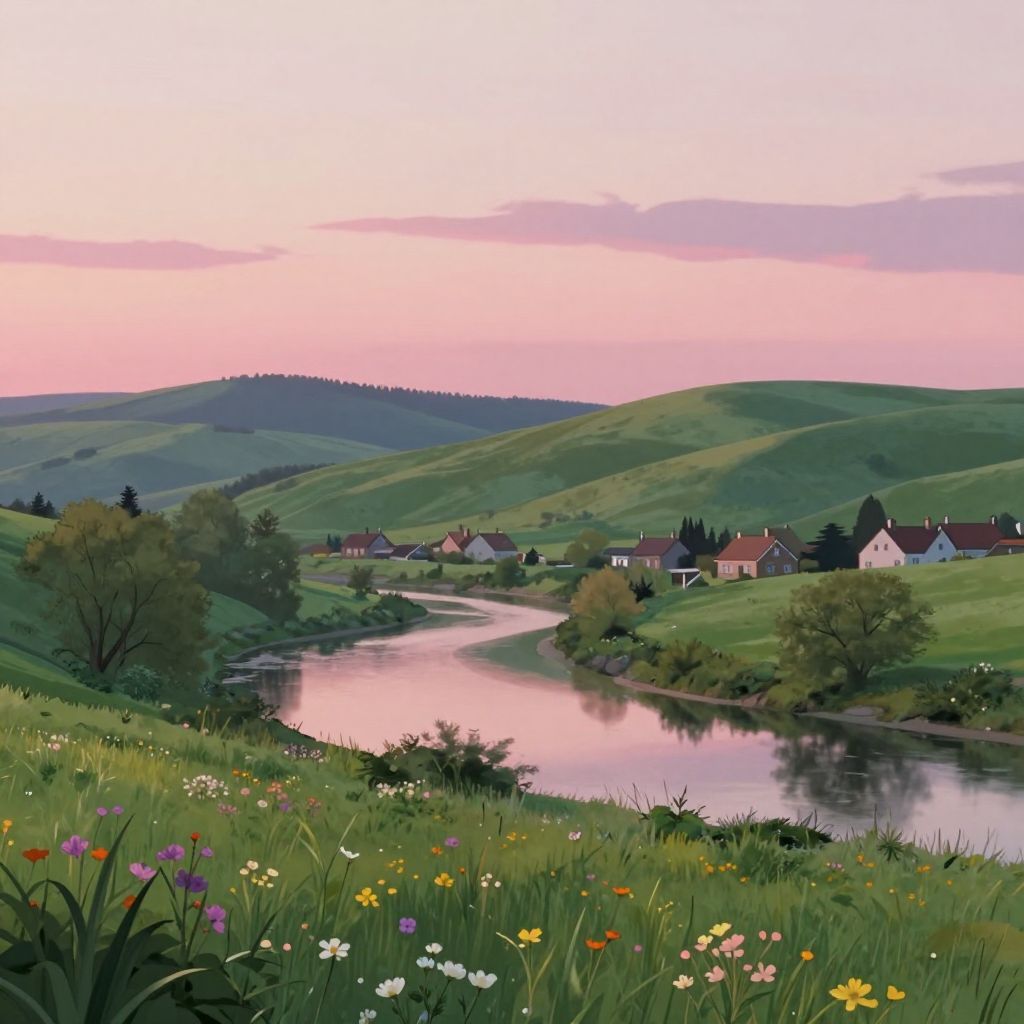 Professor Layton background art illustrating a peaceful countryside scene at dusk, featuring rolling green hills, a calm river reflecting the pink sunset sky, flowering meadows, and distant silhouettes of quaint houses, conveying a tranquil yet intriguing puzzle environment.