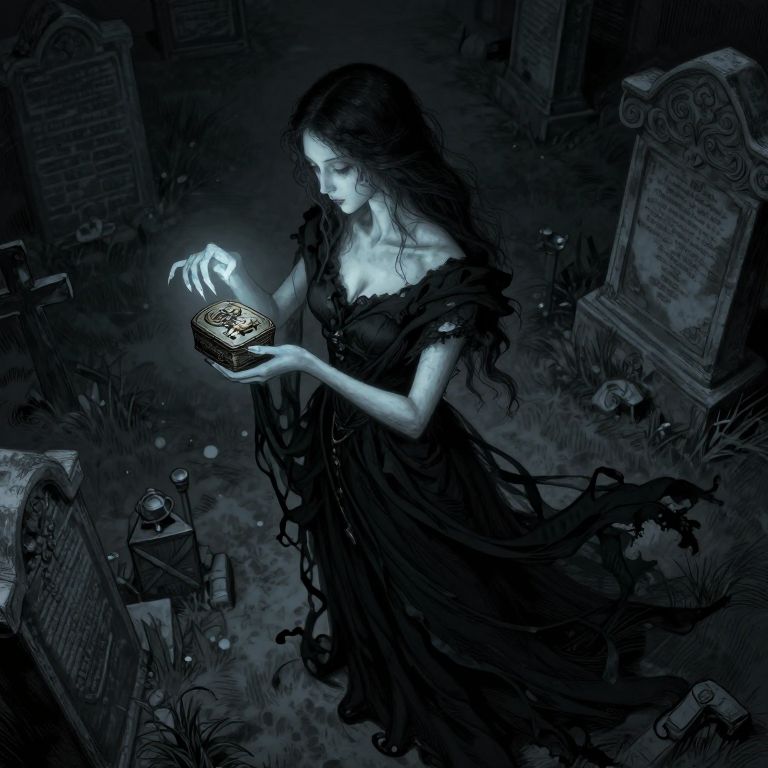 Gothic digital illustration of a pale woman with long black hair, wearing a dark dress, standing in a shadowy, grave-filled cemetery at sunset