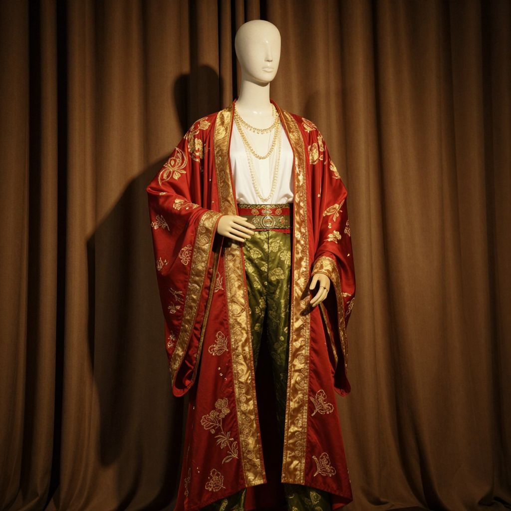 A mannequin wearing a red and gold robe with a white shirt and green pants, standing in front of a brown curtain. The mannequin has a tall, slender build with a confident posture, exuding elegance and sophistication. The red and gold colors create a striking contrast against the brown curtain, drawing the eye to the mannequin's detailed craftsmanship and the intricate patterns of the robe. The scene is set in a dimly lit, elegant interior with soft shadows and subtle lighting, enhancing the mannequin's dramatic presence.