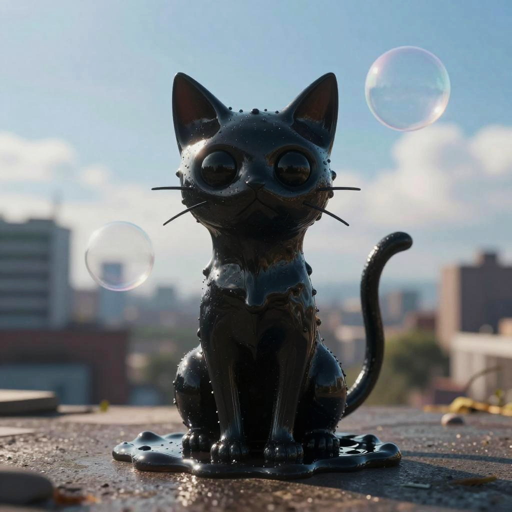 [:(by Fireflufferz, by Jorge Jacinto, by Cory Loftis):0.35], solo (feral cat slime \(blob\), black body, tail, black dot eyes:1.3), (full-length portrait, glistening body, macro, multilevel macro:1.25), (city, blue sky, cloudscape, bubble:1.15), , detailed background, depth of field, shadow, ambient silhouette, backlighting, masterpiece, best quality, ultra realistic, 4k, 2k, (high detail:1.25), (3d \(artwork\):1.2), blender \(software\), soft focus, ray tracing, (unreal engine:1.3), absurd res
