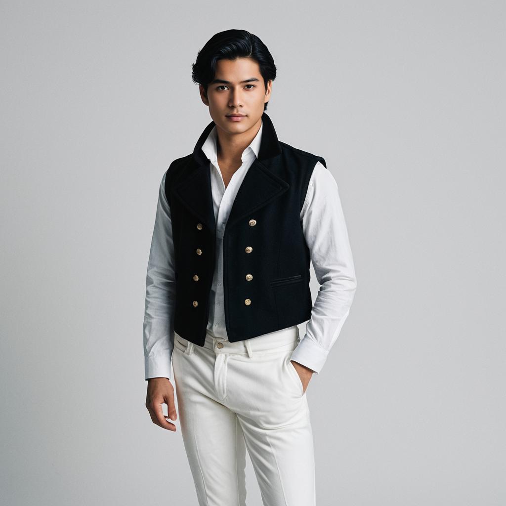 Bridgerton inspired outfit,1boy, solo, male focus, realistic, white pants, pants, black hair, vest, coat, standing, looking at viewer, shirt, long sleeves, closed mouth, white shirt