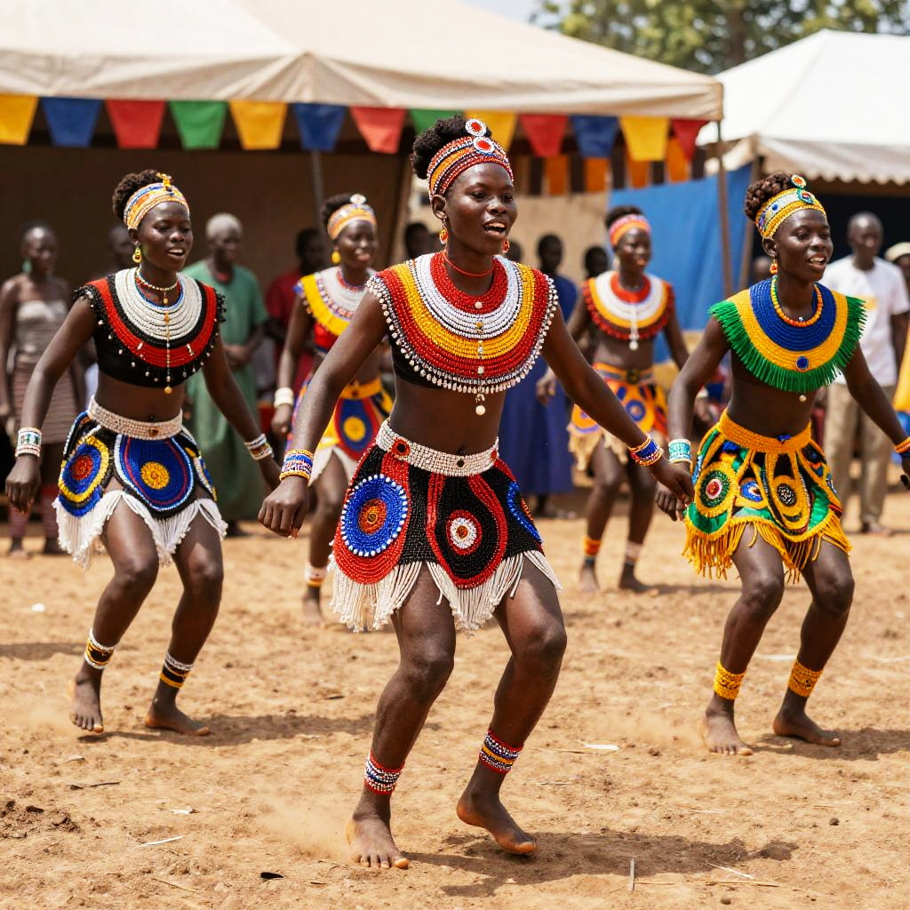 Mandingo party cultural festival with dancers performing traditional dances, colorful costumes, intricate beadwork, joyous expressions, vivid colors, detailed background with festival tents and decorations