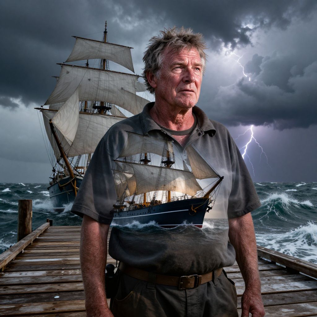 Photograph of an older white man with disheveled gray hair, standing on a wooden dock in a stormy sea. He wears a dark, short-sleeved shirt with a reflective image of a ship on the front. Behind him, a large, old sailing ship with billowing white sails is anchored in turbulent, dark blue waves. The sky is filled with ominous, dark clouds, and a bright lightning bolt illuminates the scene. The man's expression is serious, and the overall mood is dramatic and intense, highlighting the power of nature and the sea.