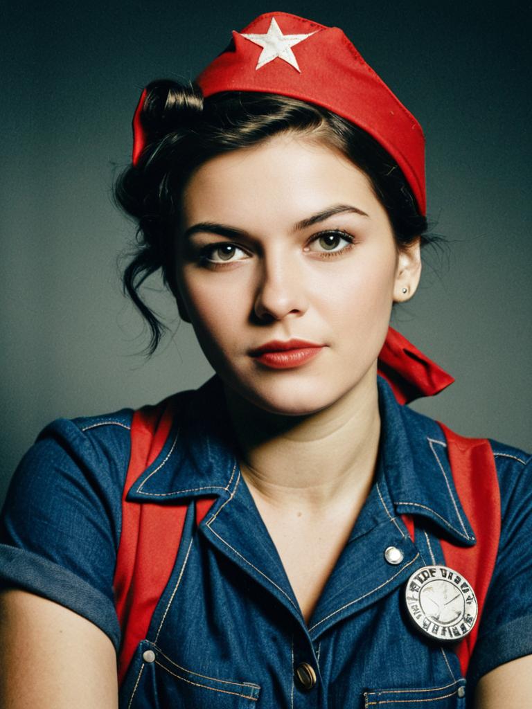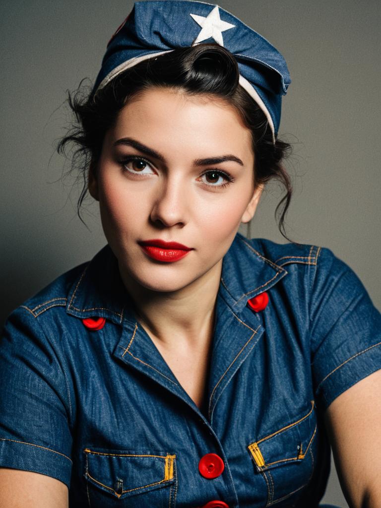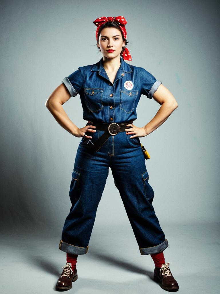 Woman in Rosie Riveter costume, cosplay editorial photography, realistic tones