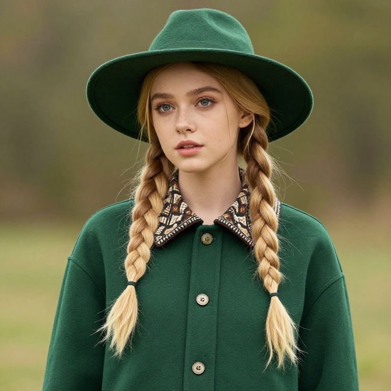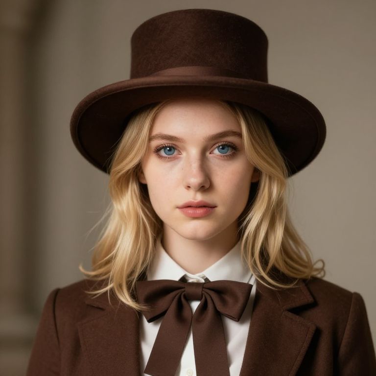Girl with blonde hair and blue eyes wearing a red dress with a white collar and a red hat.
