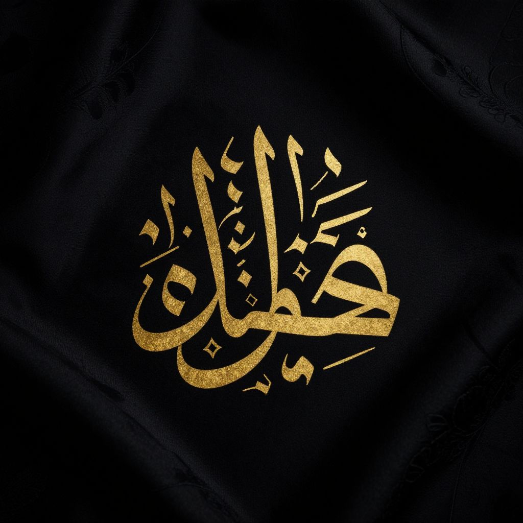 Arabic symbol for love rendered in elegant gold calligraphy on a luxurious black silk fabric, with subtle floral motifs and a sophisticated, romantic atmosphere